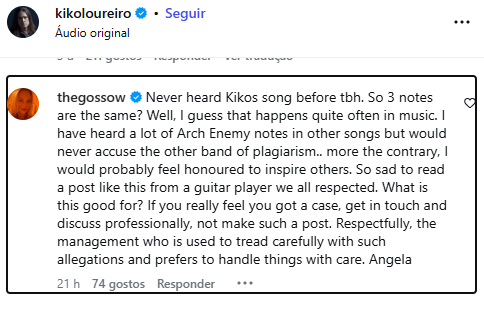 Nunca tinha ouvido a música do Kiko antes, para ser sincera. Então, três notas são iguais? Bem, acho que isso acontece com bastante frequência na música. Já ouvi muitas notas do Arch Enemy em outras músicas, mas jamais acusaria a outra banda de plágio… pelo contrário, provavelmente me sentiria honrada em inspirar outros. É triste ler um post como esse de um guitarrista que todos nós respeitávamos. Para que serve isso? Se você realmente acha que tem um caso, entre em contato e discuta profissionalmente, não faça um post como esse. Respeitosamente, a equipe de gerenciamento, que está acostumada a lidar com esse tipo de acusação com cautela e prefere tratar as coisas com cuidado. Angela