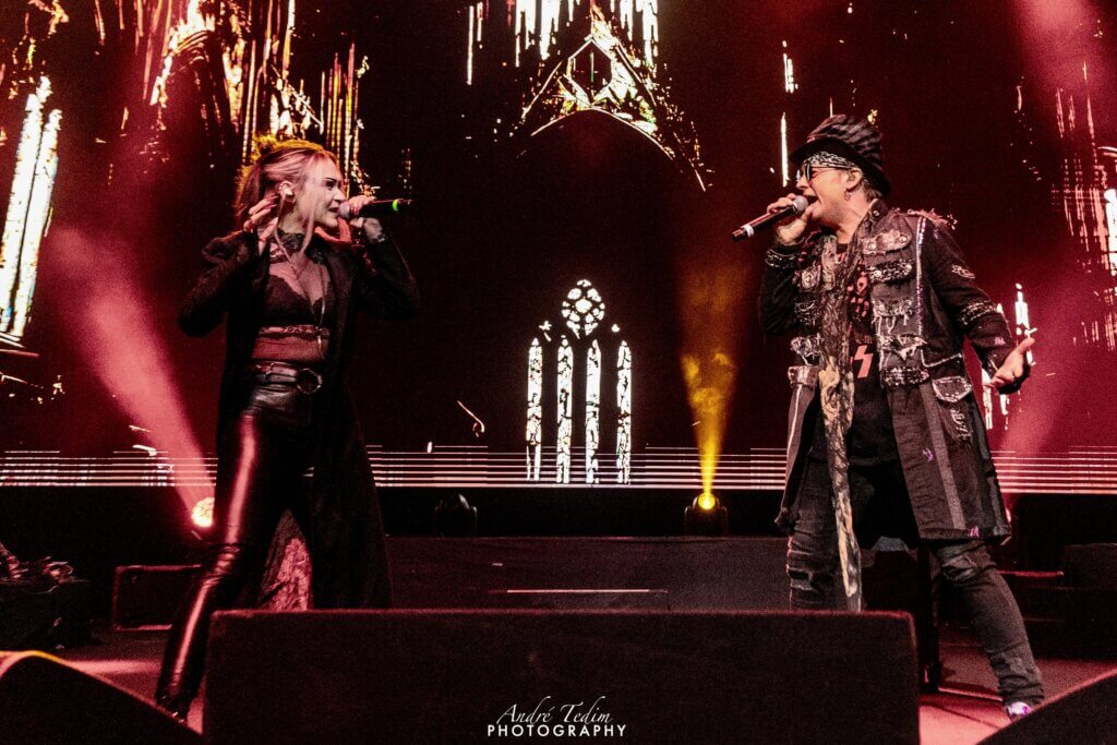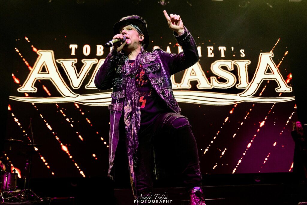 Com a pista única bastante cheia e o mezanino também repleto na área central, às 21:06h então as luzes se apagam e logo a cortina é removida para revelar a banda já posicionada abrindo com a óbvia “Creepshow” e seu refrão convidativo que faz todo mundo sair do chão: ‘Get up, get up, come out!’. A bateria de Felix Bohnke (EDGUY) encontra-se do lado esquerdo, onde também ficam o baixista Anthony e o guitarrista co-produtor do projeto, lenda viva da cena power metal, Sascha Paeth. À direita e ao fundo, em uma estrutura de degraus, os vocalistas de apoio Adrienne Cowan (SEVEN SPIRES), Herbie Langhans (RHAPSODY, SEVENTH AVENUE, outras) e Chiara Tricarico (TEMPERANCE); abaixo deles, o tecladista Michael “Miro” Rodenberg (KAMELOT, SHAAMAN, outras) e o guitarrista Andrew. Ao centro do palco com o imenso telão que compõe o cenário, o dono da festa: Tobias Sammet, com sua já conhecida cartola e óculos escuros, é recebido com muitos gritos da plateia e começa a conduzir o espetáculo, sempre se movendo de um lado para o outro. Passada a intro, já temos um clássico da carreira: “Reach out for the Light”, cujo lick marcante é cantado pela plateia com ô-ô-ôs. Na ausência de Michael Kiske (HELLOWEEN), que gravou a faixa originalmente, o dueto fica a cargo da mais nova – de idade e na família -, Adrienne, que impressiona tanto pela presença de palco quanto pela potência vocal, especialmente na nota super alta e aguda que precede o interlúdio, durante o qual Tobias saúda a plateia e garante que a noite será explosiva. Merecidamente, a cantora é ovacionada ao final da performance e agradece o carinho dos fãs com um gesto de coraçãozinho. Comentando que 7 meses longe do Brasil é tempo demais, Tobias reforça que a noite terá muita coisa nova, mas também sucessos mais antigos, e relembra a todos que por ser esse o último show do ano, será a memória dele que eles levarão de volta pra casa.