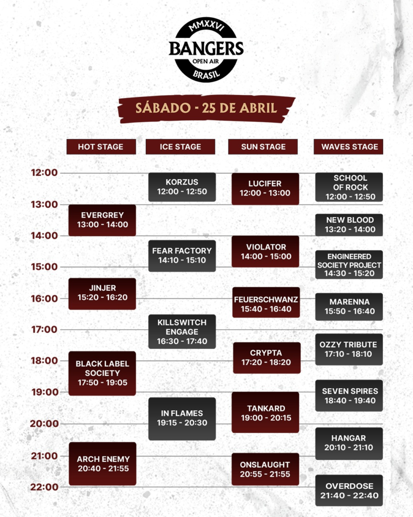 A organização do Bangers Open Air divulgou nesta quarta-feira (18), a grade de horários dos shows que acontecem nos dois dias do festival, em 25 e 26 de abril, no Memorial da América Latina em São Paulo.