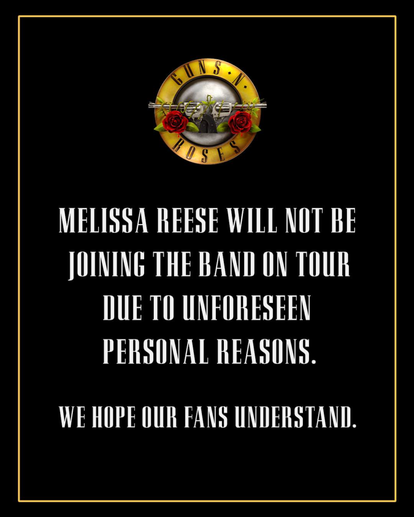 O Guns N’ Roses anunciou em suas redes sociais neste sexta-feira (27), que a tecladista Melissa Reese não estará na próxima turnê da banda, que inclui shows no Brasil.