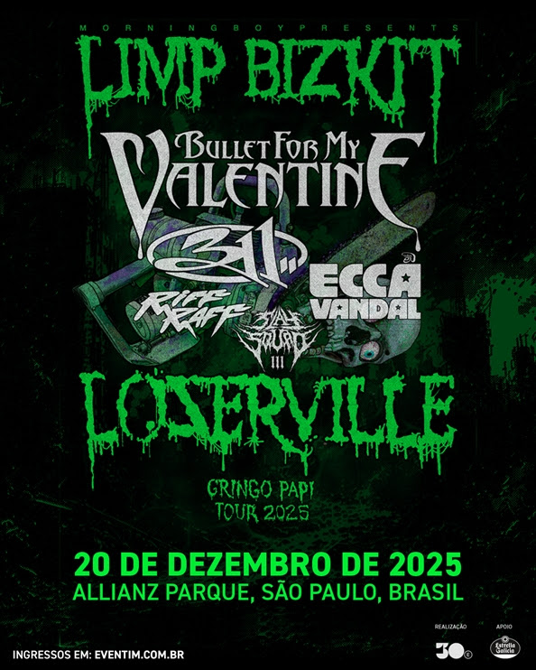 “Welcome to the jungle, punk, take a look around. It’s Limp Bizkit…”, (Bem-vindo à selva, punk, dê uma olhada. É o Limp Bizkit…). O trecho de “My Generation” (2000) traduz a energia caótica e intensa das performances do grupo Limp Bizkit na LOSERVILLE TOUR 2025, projeto do frontman Fred Durst que passou pelos Estados Unidos e pela Europa nos últimos meses. Agora, a turnê, que tem participação de Bullet For My Valentine, 311, Ecca Vandal, Riff Raff Slay Squad, finalmente chega ao Brasil neste sábado, 20 de dezembro, no Allianz Parque, em São Paulo. O evento é uma realização da 30e, maior companhia brasileira de entretenimento ao vivo, e os últimos ingressos estão disponíveis no site da Eventim (acesse aqui).