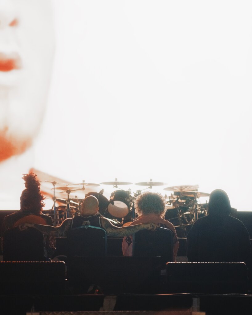 As 9:20 da noite, após um desfile de atrações durante o dia (leia aqui), as luzes do estádio se apagaram, e o telão acendeu com os dizeres “Sam Rivers Legendary“, e ali se seguiu uma homenagem ao baixista, amigo e parceiro que se foi, mostrando imagens de diversos períodos diferentes do músico e os demais integrantes da banda assistindo a homenagem ao som da música “Drown“.