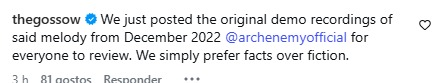 A banda postou em suas redes sociais um vídeo onde mostra as demos da nova faixa, datadas de 2022, e no fim da postagem, Michael Amott termina em tom de ironia sobre a acusação de Kiko: