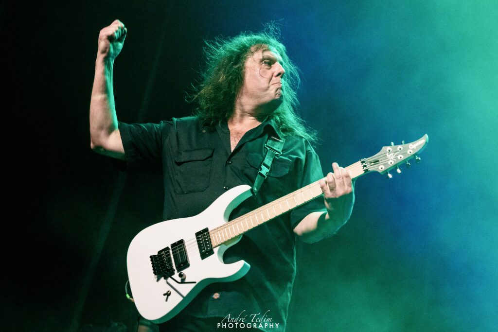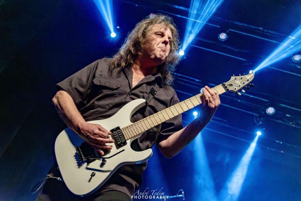 Andy, enquanto briga um pouco com um microfone que não parece estar bem regulado, cumprimenta o público e esbanja seu portunhol para dizer que está feliz em retornar ao país, apresenta a banda e agradece a receptividade. Para encerrar seu show em grande estilo, a banda faz um medley com trechos de covers, trilhas de animes e jogos – indo de Journey a Cavaleiros do Zodíaco – e Andy ativa sua icônica roupa ornamentada com leds coloridos que lhe confere uma vibe futurista/robótica, condizente com a precisão na execução de suas notas. O ponto alto fica para o momento em que ele sola com a guitarra nas costas, arrancando aplausos de todos.